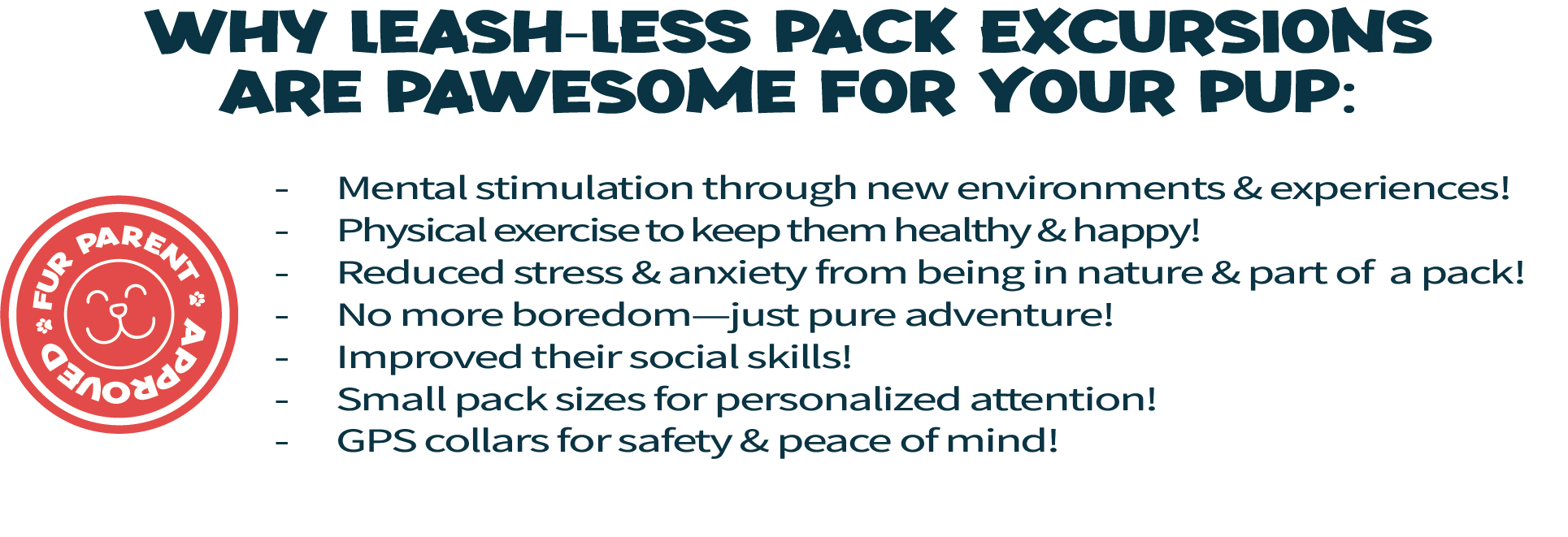 Our leash-less pack excursions are way more fun than your average walk around the block! If your dog is super active loves meeting other pups and thrives on running free & exploring the outdoors, this is the perfect adventure for them!